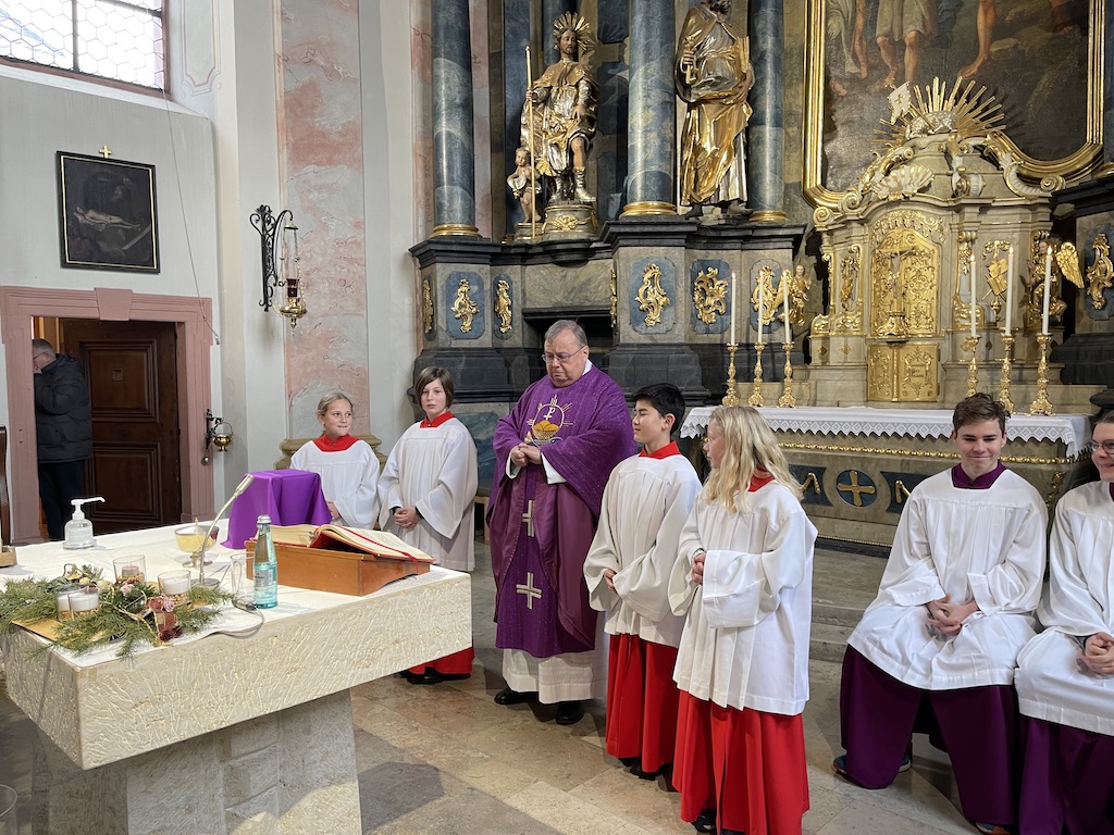 Schon bald näherte sich der Höhepunkt des großartigen Gottesdienstes: Der Aufnahme in den Ministrantendienst. Während der Rede unseres Oberministranten erfuhren wir einiges über die gemeinsame Zeit mit unseren Neuen. Dann war es so weit: Unser Pfarrer Franz Leipold nahm Lilli Braunwarth, Maximillian Vacek, Emma Keller und Saskia Manthey das Ministranten-Versprechen ab. Elias Maniura konnte den Gottesdienst leider nicht dabei sein, aber in Gedanken war er natürlich mit dabei. Nun sind sie offiziell ein Teil unserer großen Gemeinschaft.